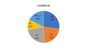 内定獲得社数については、最も多かったのは1社となりました。しかし、2社以上獲得している学生は全体の73%となりました。多い学生では10社以上内定を獲得した学生もみられました。